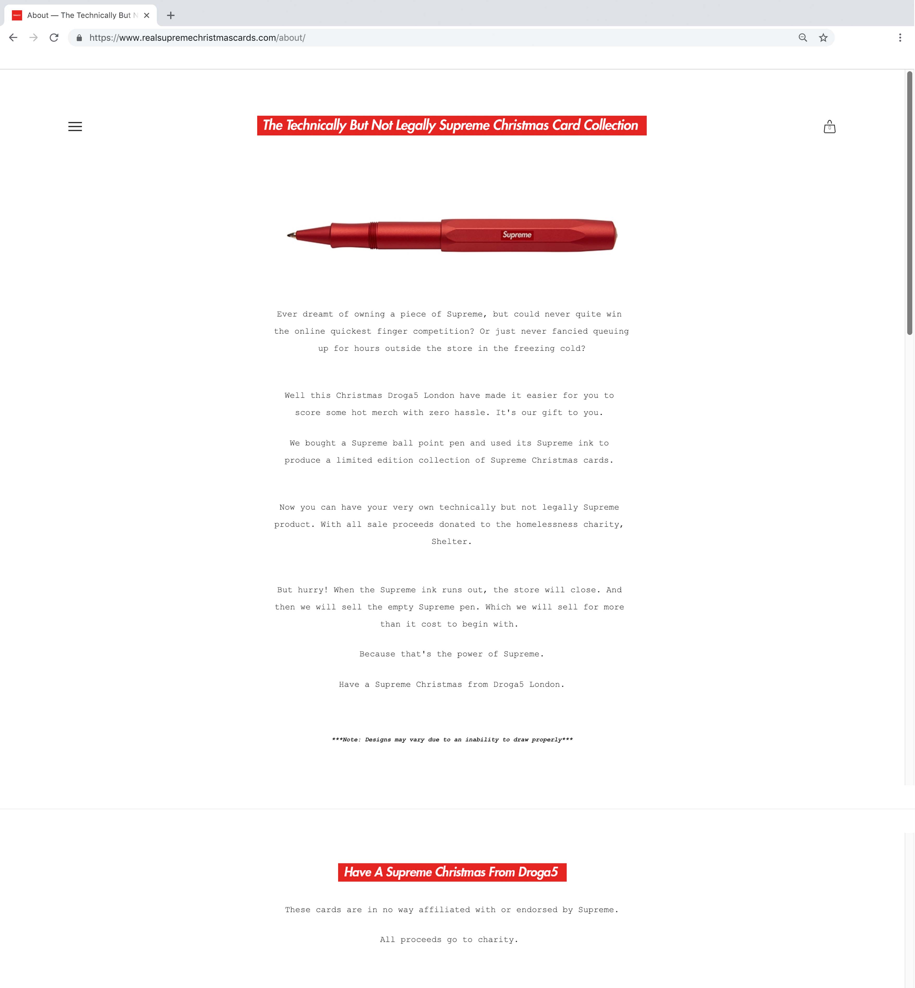 We bought a Supreme ball point pen and used its Supreme ink to produce a limited edition collection of Supreme Christmas cards. So you could own a technically but not legally Supreme Christmas card.